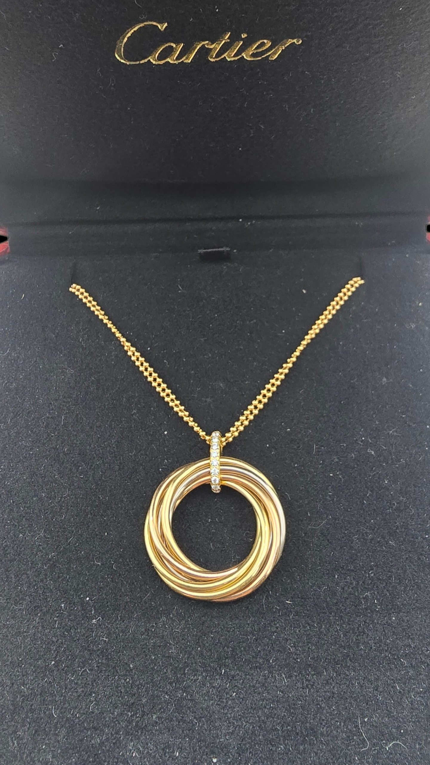 Cartier Trinity Anhänger aus 18-karätigem Gold, drei bewegliche Ringe im ikonischen Design – zeitlos und elegant.
